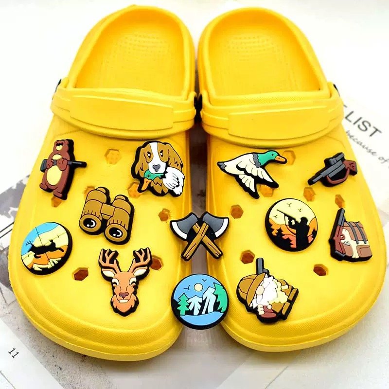 For the wilderness lover, hunting & outdoor shoe charms feature deer, elk, fishing lures, and campfires. Rugged and vibrant, they bring outdoor adventure to your slides. Molded from sturdy PVC, these charms have a matte-textured finish on antlers and realistic grooves on lure bodies — some even incorporate tiny glitter flakes within the PVC to simulate water sparkle. These unique charms often use glow-in-the-dark details — ideal for evening beach bonfires. They’re also popular among the construction crew crowd who love utility style. Pair with camo straps for full summer essential energy.