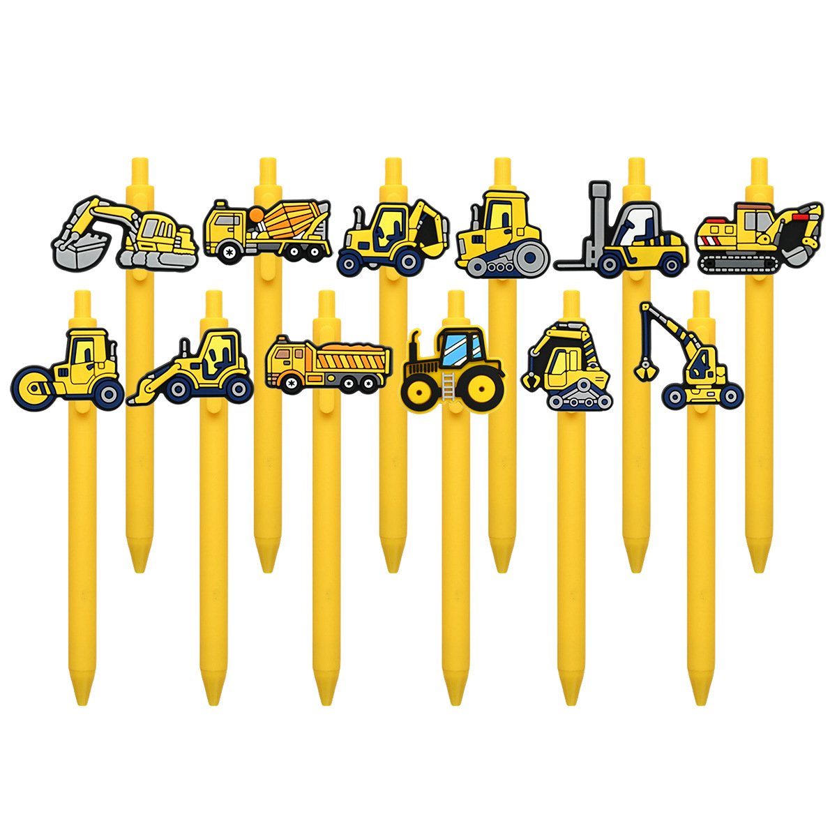 Each pen comes with a distinct construction truck topper, covering all classic heavy machinery: forklift, backhoe loader, road roller, bulldozer, skid-steer loader, crane, paver, tracked excavator, wheel excavator, tractor, dump truck, and concrete mixer. Collect all styles for a complete construction fleet!
