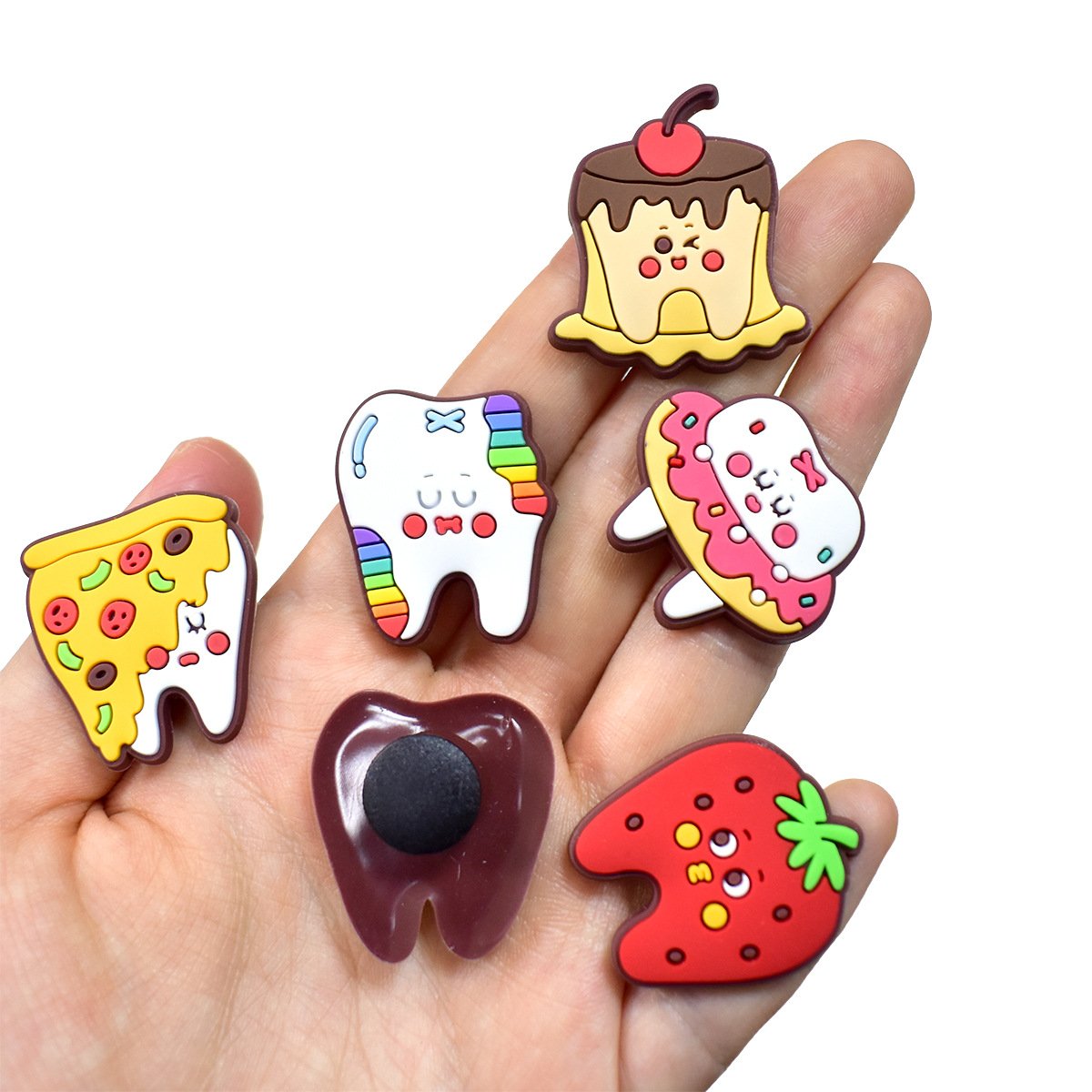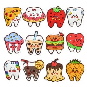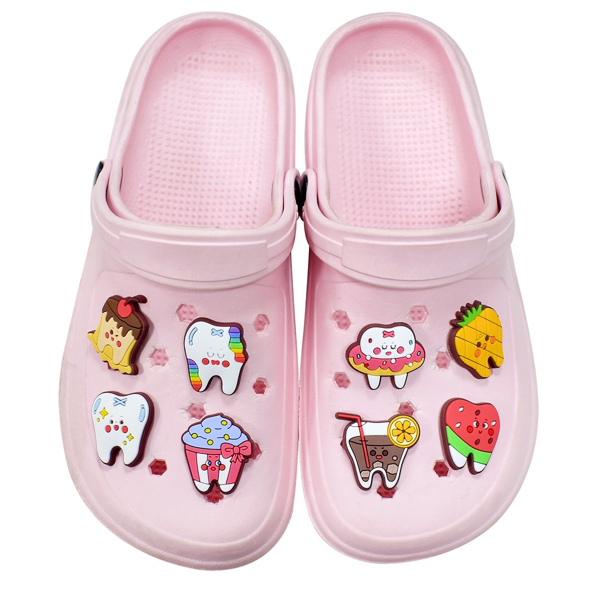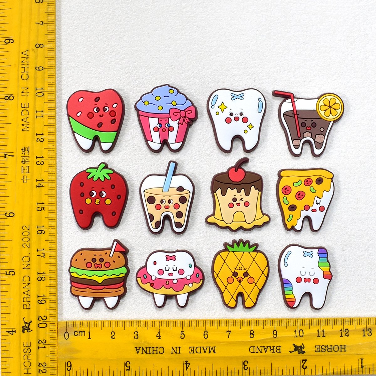 Our 12-piece shoe charm set is the perfect way to add personality and fun to any pair of clogs or shoes with holes. Each charm features a unique, adorable design that combines playful food themes with a friendly tooth character, making them a hit with kids, teens, and adults alike.