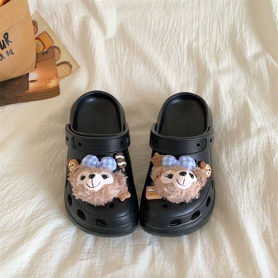 Fluffy Teddy Bear-Themed Black Croc Clogs with Checkered Bow Shoe Accessories